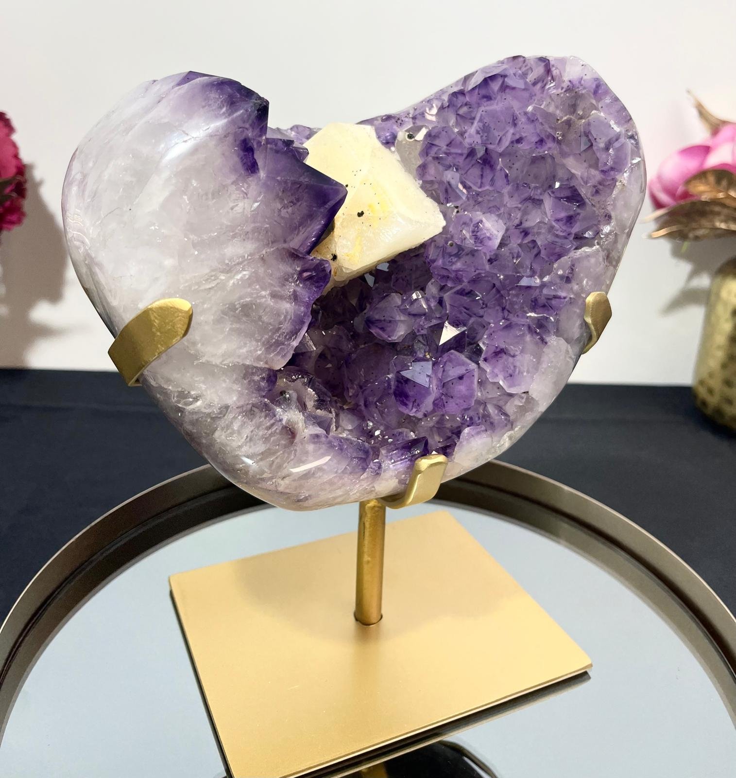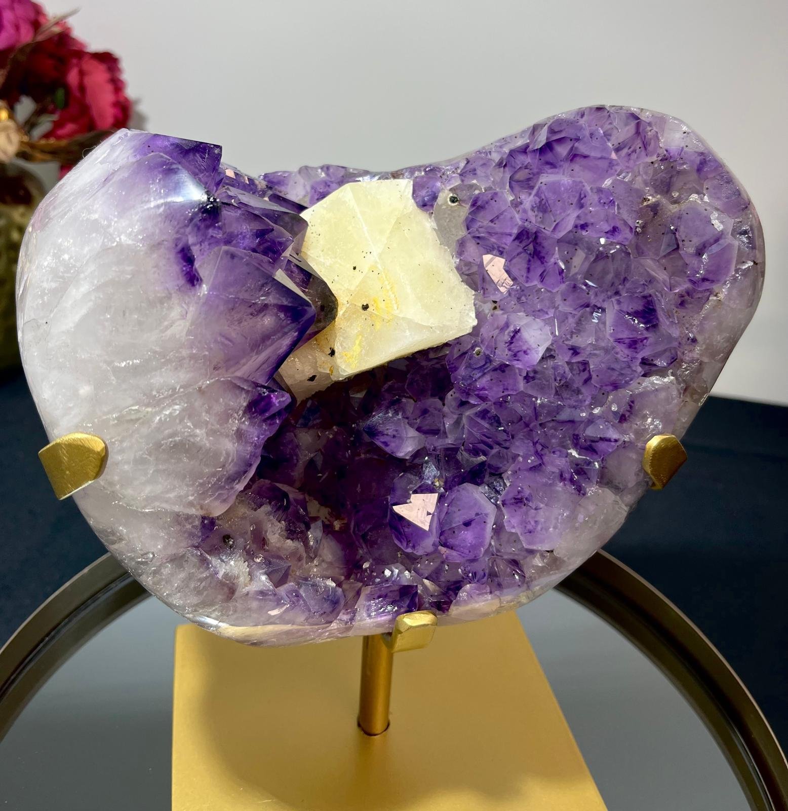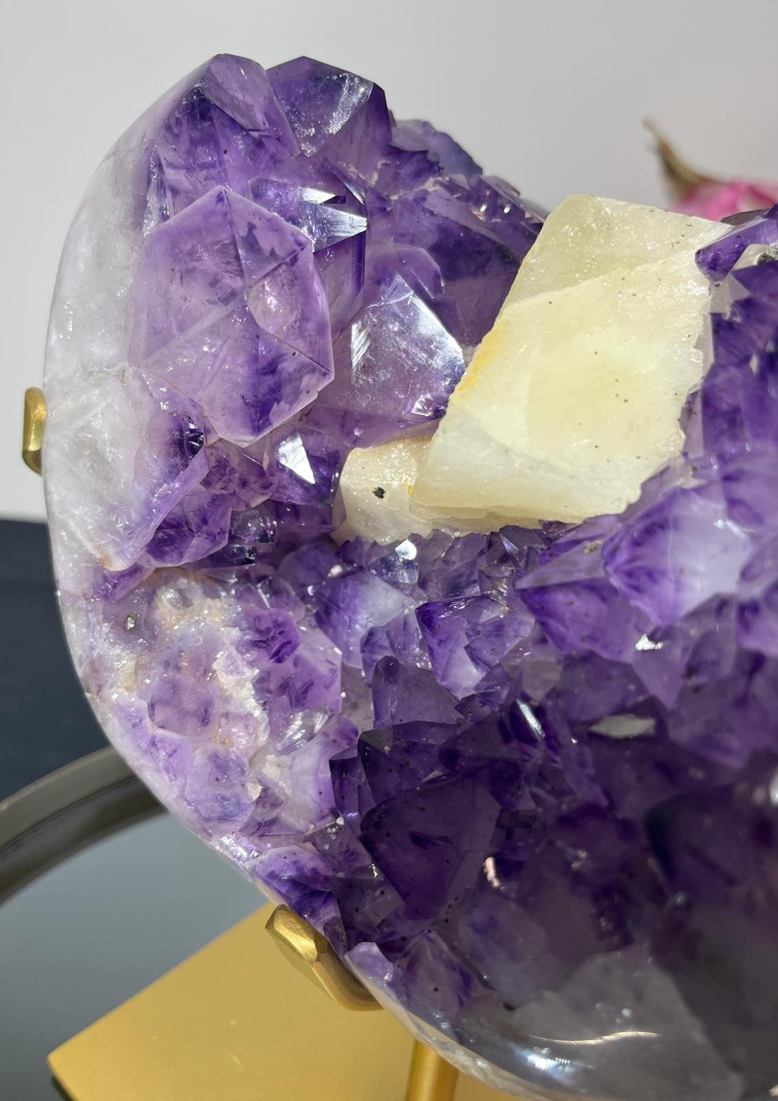 Améthyste brute avec cube de calcite sur socle doré.